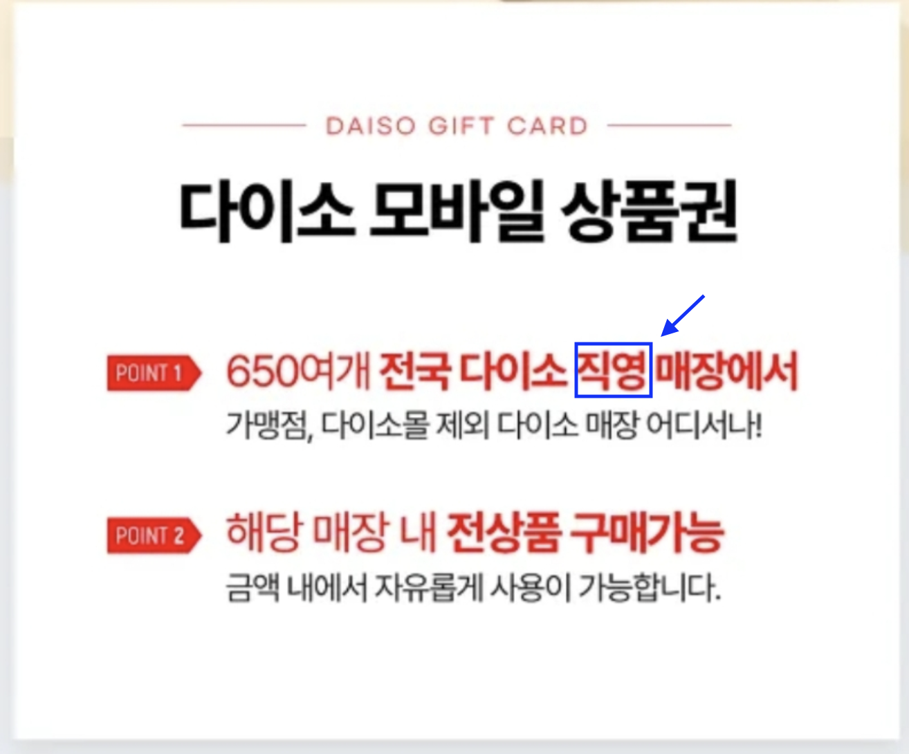 다이소 직영점은 본사에서 직접 운영을 하는 곳으로 점포의 수입이 본사로 귀속이 되며 모든 직영점의 영업시간이 오전 10시에서 오후 10시로 동일하다고 하며 휴무일은 설날 당일, 추석 당일 이렇게 1년이 단 2번만 쉰다고 합니다. 또한 말씀드린 부분처럼 가맹점보다 매장 평이 엄청 넓어 가맹점 보다 많은 상품들이 있는 것이 특징입니다. 다만 단점으로는 개인이 운영을 하는 것이 아니다 보니 재난지원금, 이음카드, 각종 페이 등 사용이 불가하지만 현재는 다이소 직영점에서만 다이소 모바일 상품권 사용이 가능하다고 합니다.